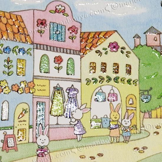 表紙はプレゼントを抱えてお祝いに向かうウサギたちが居る街並み。