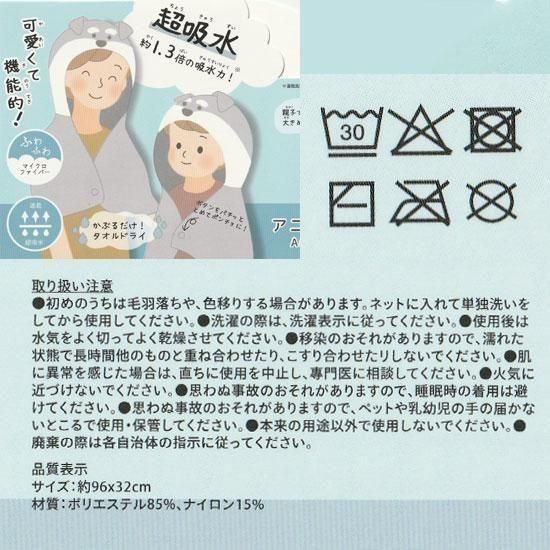 かわいい動物デザインのフード付きタオル。 ふわふわのマイクロファイバー素材で吸水力があります。